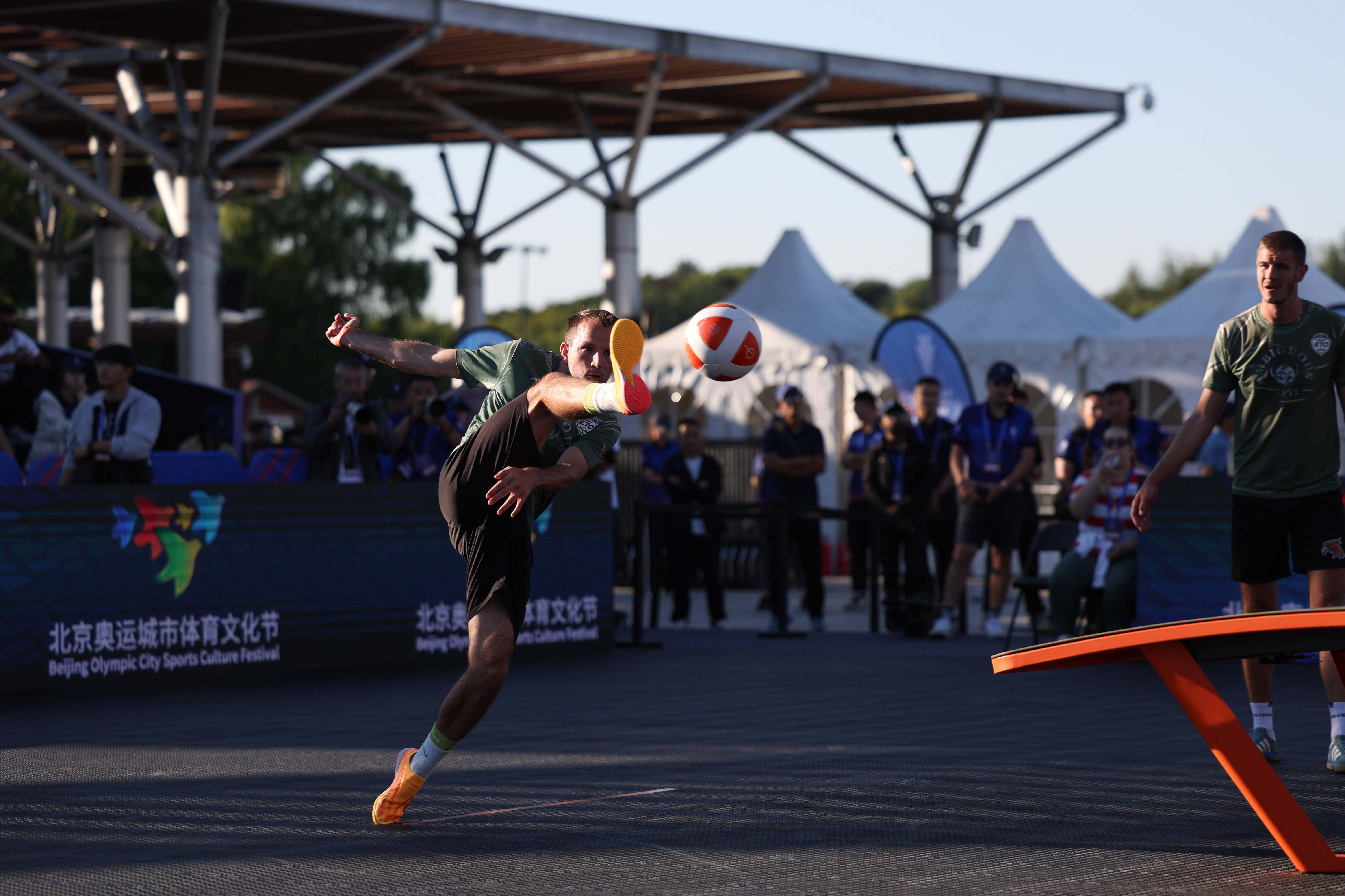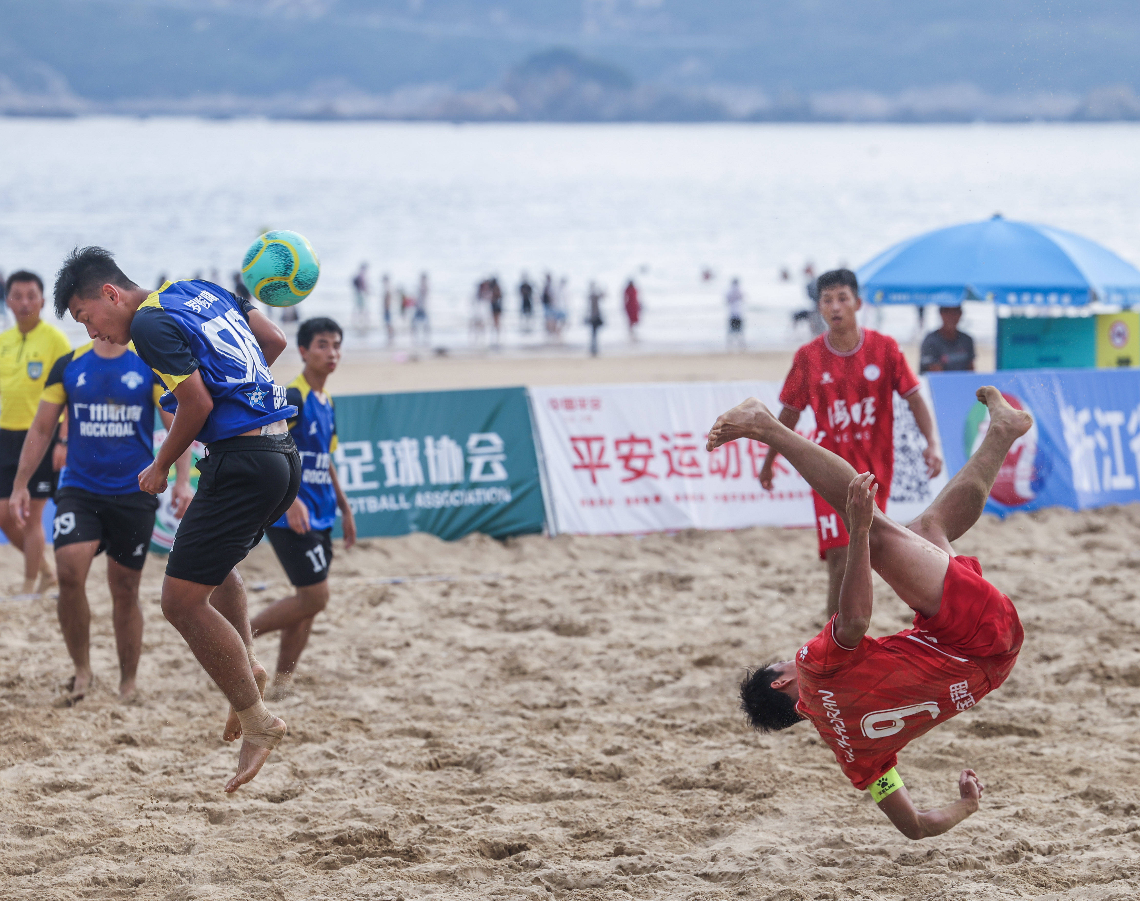 2025年10月17日,在浙江舟山进行的全国男子沙滩足球锦标赛现场。新华社记者 徐昱 摄另一个既和足球有关又极具观赏性的项目是台克球,同样在御海路竞赛场馆群举行。该项目起源于匈牙利,是一个集足球技术、乒乓球规则与乒乓设备于一体的运动。国际台克球联合会于2017年在布达佩斯成立,如今全球已经有一百多个国家和地区拥有了台克球协会。在本届赛事中,台克球首次成为亚沙会正式比赛项目,设男双、女双和混双三个小项。